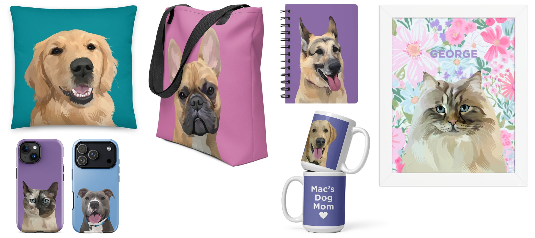 Choose a custom pet portrait framed print, tote bag, pillow, mug or any other item. Next upload your pet's portrait, choose the background color, and place your order.