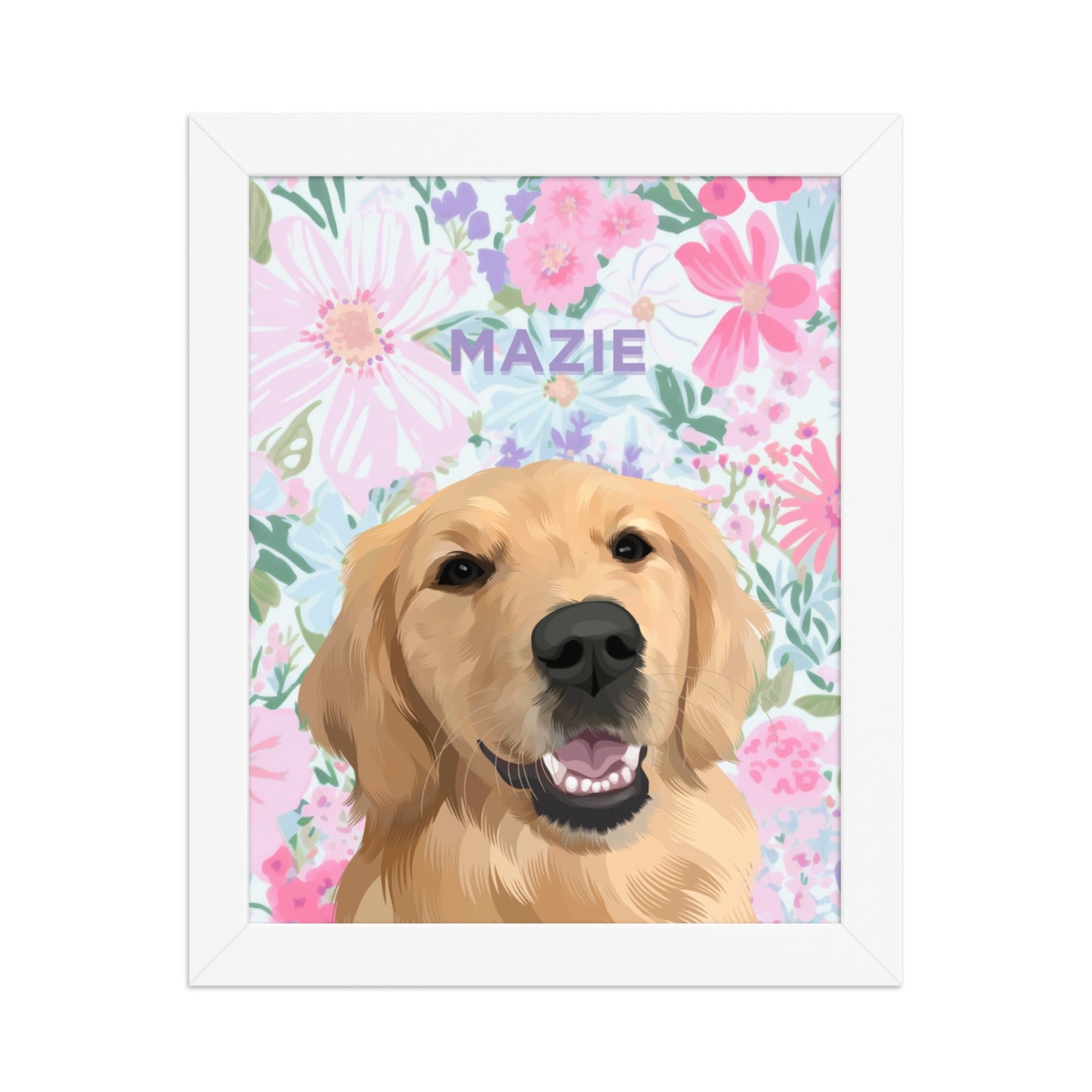 We'll work with you to choose a color for your pet's name depending on the floral background you choose. Once you approve the portrait proof, we print, frame, and ship it with care. Your custom pet portrait makes a fabulous addition to your home, and our pet portraits are also the perfect gift for any pet lover!
